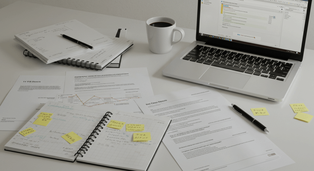 まず、これまでの面接での質問と回答を全て振り返ります。エントリーシートの内容も含めて、一貫性のある内容になっているかを確認し、必要に応じて補強すべきポイントを整理します。